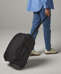 Neoprene handle, front zippered pocket, organiser section, large main compartment, concealed mono pole handle, pack away shoulder straps, fold down back flap for comfort, compressions straps, heavy duty wheel.